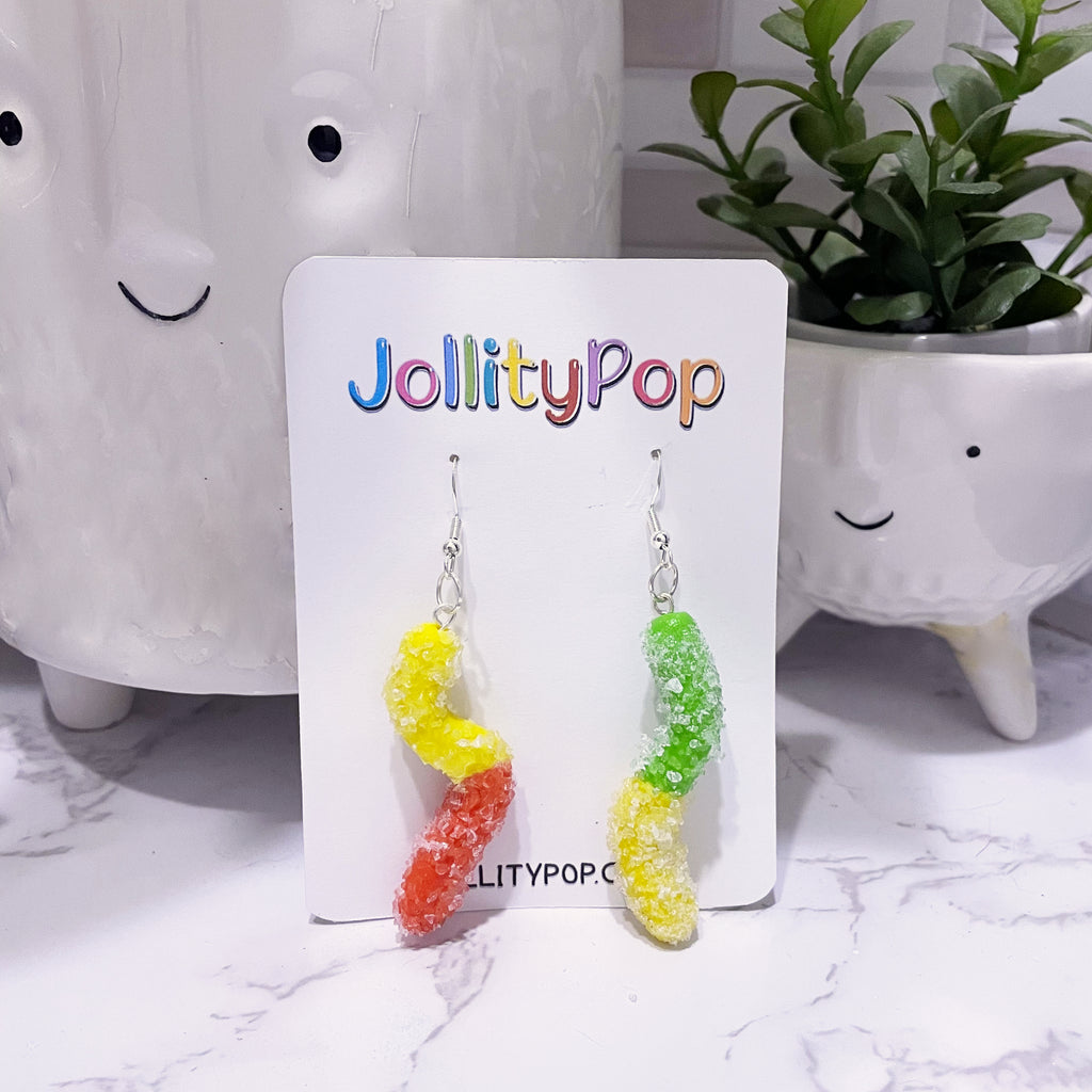 Adorable polymer clay earrings shaped like sour gummy worms. Each pair features vibrant colors and a playful, wiggly design that brings a fun, whimsical touch to any outfit. Lightweight and comfortable for all-day wear. Perfect for candy lovers, quirky fashion enthusiasts, or anyone who enjoys unique, conversation-starting accessories. Handcrafted with attention to detail, these earrings are a sweet way to express your personality.
